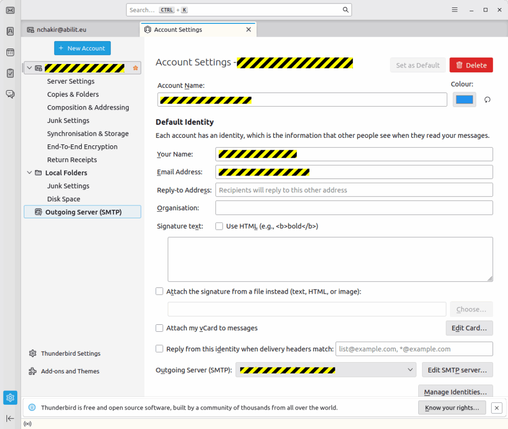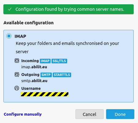 Once Thunderbird launched for the first time, it will propose you to configure you e-mail account “automatically”. Actually, it means it will guess the configuration. You can accept it, but it won’t be enough:
