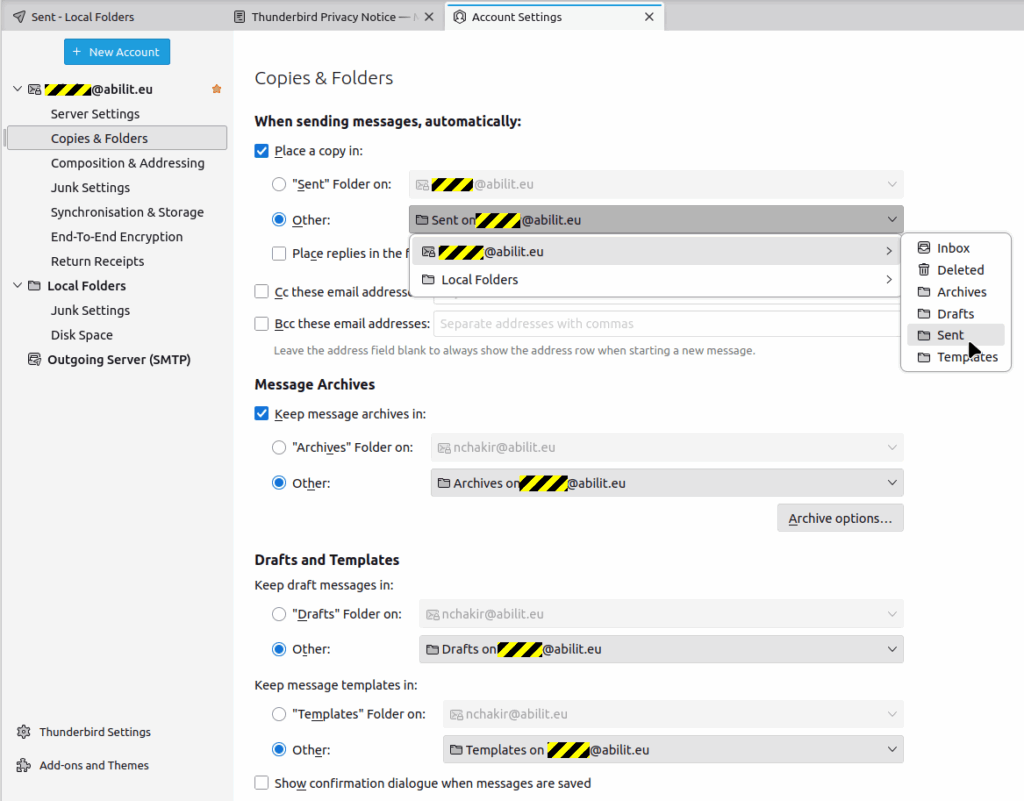 Then, you will configure your Thunderbird so that it will save those mails in those locations instead of some obscure local folder. As example, by selecting the server-based folder for Sent e-mails instead of the local one (default), you will make your sent e-mails available to other Thunderbird instances, as example Thunderbird on your Android Smartphone.