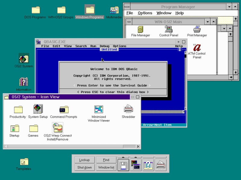 OS/2 was a very stable OS, running in “protected memory mode”, offering plain real multi-tasking, and was able to survive a system crash, actually a power outage, as the system itself was stable. If brutally power-cycled, it reloaded the user environment, including the open applications, and most of their content. It was also modular: it was possible to run plain DOS-boxes emulations, and DOS-based software inside (our BBS service software). It was even possible to run it without the GUI (that is definitely not useful, especially for a server…)